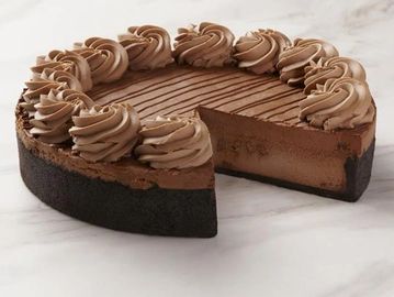 Rich Godiva® cheesecake baked with chunks of milk chocolate topped with chocolate mousse, chocolate ganache and chocolate whip cream.