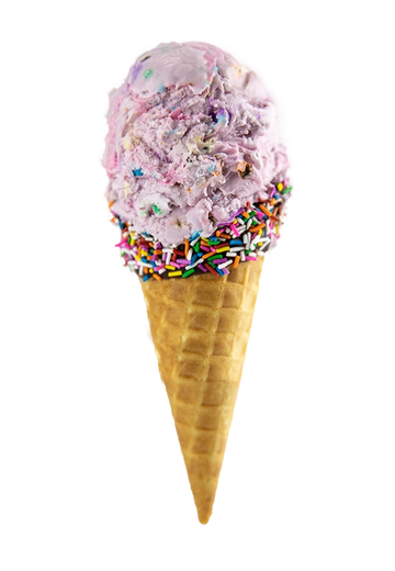 Vanilla cake Batter ice cream with a pink frosting ripple and rainbow chocolate chips.