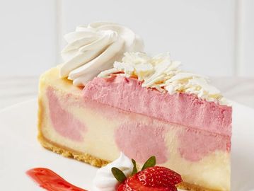Wild strawberry cheesecake and Classic cheesecake marbled together on a vanilla crumb, topped with a layer of strawberry cream and finished with whipped cream rosettes and white chocolate shavings